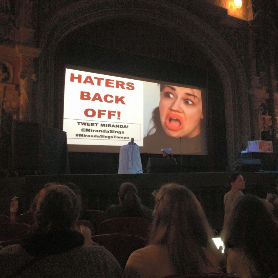 So I saw miranda sings live and it was hilarious. It was the most amazing one woman show. She even said she had been extremely sick the whole day but if she had not said anything no one would have known because she really held it together and put on a great show. It was an hour and a half of non-stop acting, singing, dancing, and jokes. She brought up people from the audience on stage and threw cheetos that were down her pants at the audience (I caught one). It was just so stupid and ridiculous but in the best way. She was very quick with cracking improv jokes at hecklers and never broke character. She is not everyones cup of tea but you have to give her credit. She's a hard working woman who has no one but herself to thank for her success....herself and of course her mirfandas.
